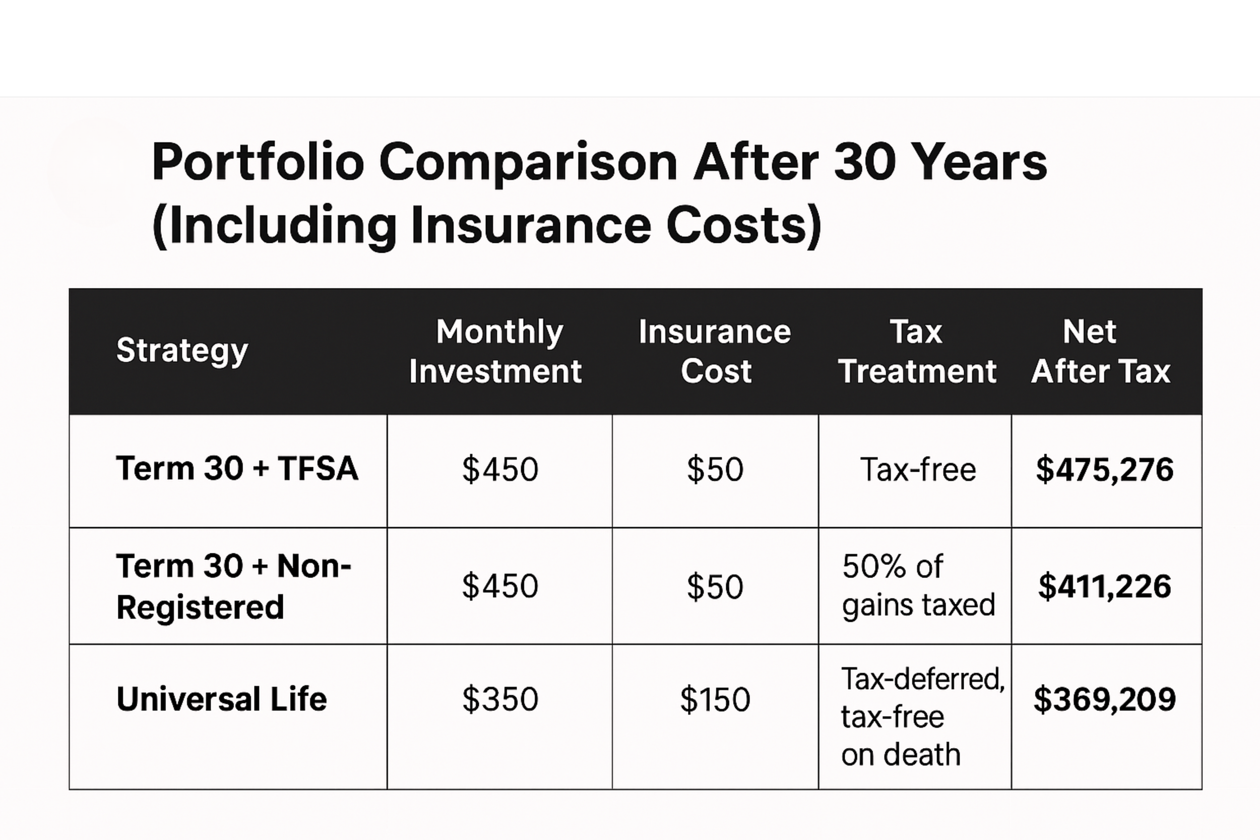When we focus purely on the numbers, the TFSA paired with Term Life Insurance (BTID strategy) generates higher portfolio growth. Even after factoring in the cost of 30-year term coverage—over $18,000 ($50/month for 30 years)—BTID still outpaces Universal Life by approximately $80,000 in the TFSA scenario and $24,000 in the non-registered segregated fund comparison.